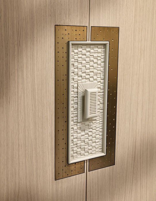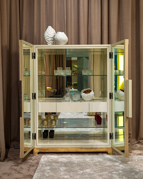 Hand-painted ivory oak wood bar cabinet with two doors. Hand-carved solid wood decorative handle. Internal in shining lacquering with three drawers, mirrored back and glass shelves. Wooden feet in gold leaf.