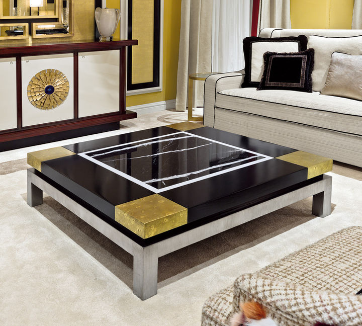 Coffee table in wood with hand-painted finish in black, gold and silver leaf. Top with central insert in black marquinia and white sivec marble.