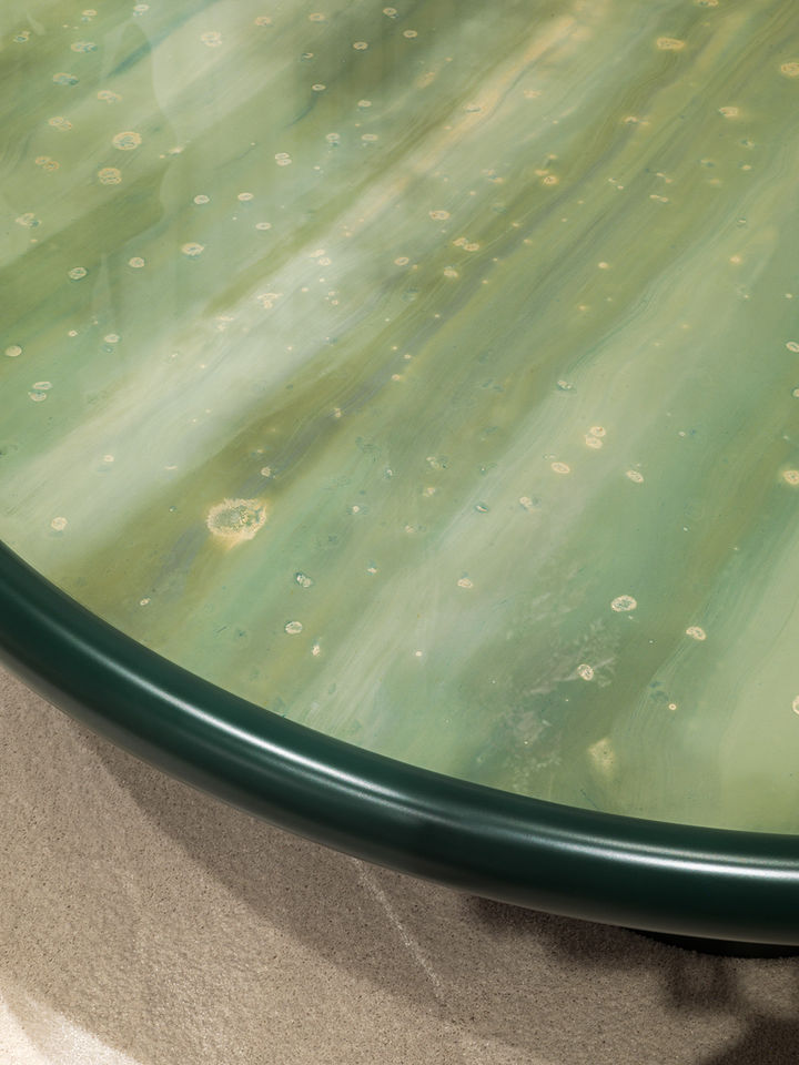 Wooden round coffee table with three feet with cylindrical base. Glass top with hand-painted decoration in different colors with gold details. Edge of the top and feet are lacquered in green color.