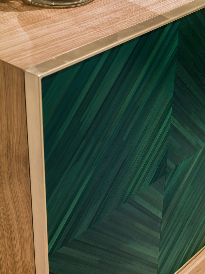 Handcrafted oak wood sideboard with two doors. Outer side in oak wood, natural color and mat finish. Doors are decorated with straw marquetry and brass elements. Glossy lacquered finish in green color, mirror inserts and glass shelves inside.